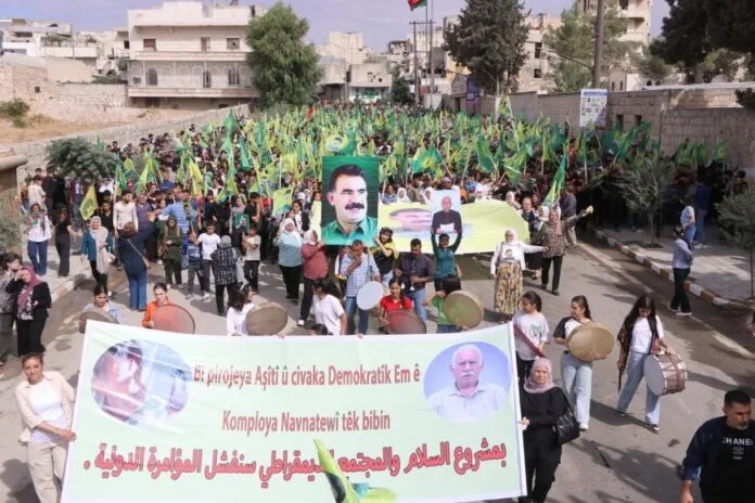 Bi dirûşma “Bi Projeya Aştî û Civaka Demokratîk, Em ê Komploya Navneteweyî Têk Bibin”, Meclisa Malbatên Şehîdan û Partiya Yekitiya Demokratîk (PYD) ji bo şermezarkirina Komploya Navdewletî ya li dijî Rêberê Gelê Kurd Abdullah Ocalan meşek li dar xistin.