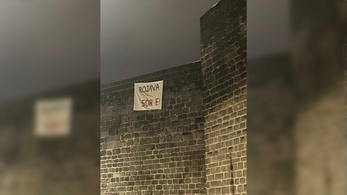 Ciwanên Welatparêz ji bo piştgiriya berxwedana li Taxên Şêxmeqsûd û Eşrefiyeyê bi sûrên Amedê ve pankarta “Rojava xeta sor e” daliqandin.
