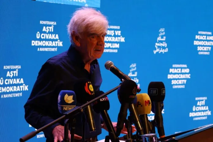 Tiştên derheqê Ocalan û Rojava de xwendine û bihîstine, ronahî ne. Ji bo me cihekî pirr taybet ê tevgera Kurd heye, ronahî û şewqek mezin dide me. Ev ronahiya rûmetê ye. Ronahiya hêrsa li dijî tariyê ye. Rica dikim vî tiştî ji bîra nekin ku hûn bêqisûr in, hûn gelekî taybet in, Tevahiya cîhanê çavê wan li we ye. Ez ji bo hezkirin û piştgirî û azadiya Ocalan hatim vir. Ji bo pêvajoya aştiyê spasiya birêz Ocalan û we dikim.”