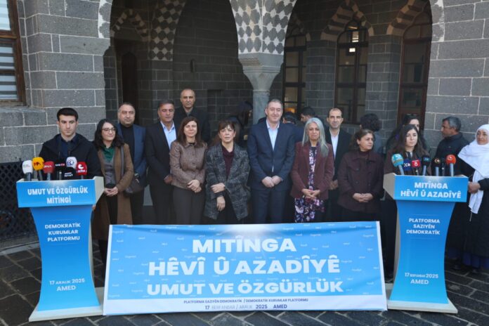 Platforma Saziyên Demokratîk a Amedê dê, 4ê çileya 2026an, li Amedê bi dirûşma “Hêvî û azadiyê” mitîngekê li dar bixe. Di mitîngê de dê azadiya Rêberê Gelê Kurd Abdullah Ocalan bê xwestin. Platformê ji bo mitîngê, 17ê kanûnê, daxuyaniyek da. Nûnerên partiyên siyasî û rêxistinên civakî beşdarî daxuyaniyê bûn. Têkildarî armanca mitîngê û xebaten mitîngê Endamê Komîteya Amadekar a Mitînga 4ê çileyê, Bedirxan Çetînkaya nirxandin kirin.
