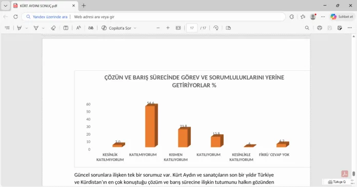 Beşdarên anketdê pirsa “Di pêvajoya çareserî û aştiyê de erk û berpirsiyariya xwe pêk tînin.” Jî bersivandin. Ji sedî 54.6ê beşdarên anketê diyar kirin ku beşdar nabin, ji sedî 13.8 beşdarên anketê jî anîn ziman ku beşdar dibin ku erka xwe pêk tînin.