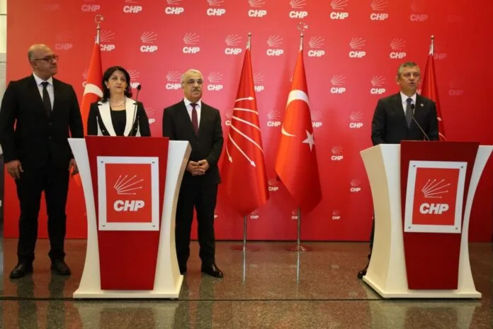 Endamên Heyeta Partiya Wekhevî û Demokrasiyê ya Gelan (DEM Partî) ya Îmraliyê ku ji parlamentera Wanê Pervîn Buldan, parlamenterê Rihayê Mîthat Sancar û parêzerê Buroya Hiqûqê ya Sedsalê Faîk Ozgur Erol pêk tên tekildarî pêvajoya Aştî û Civaka Demokratîk serdanên partiyên siyasî didomînin. Endamên heyetê li Navenda Giştî ya CHPê bi Serokê Giştî Ozgur Ozel re hevdîtin pêk anîn. Hevdîtina Heyetê û Ozgur Ozel zêdetirî seateke dewam kir.