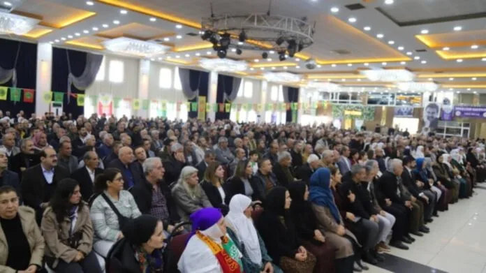 Di civîna ku bi hezaran kes beşdarbû de, posterên Rêberê Gelê Kurd Abdullah Ocalan û pankartên têkildarî civînê li salonê hatin daliqandin.